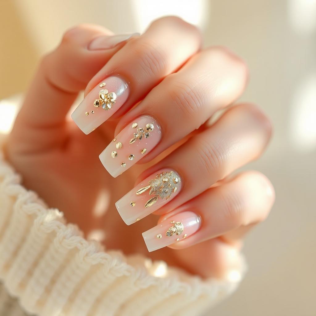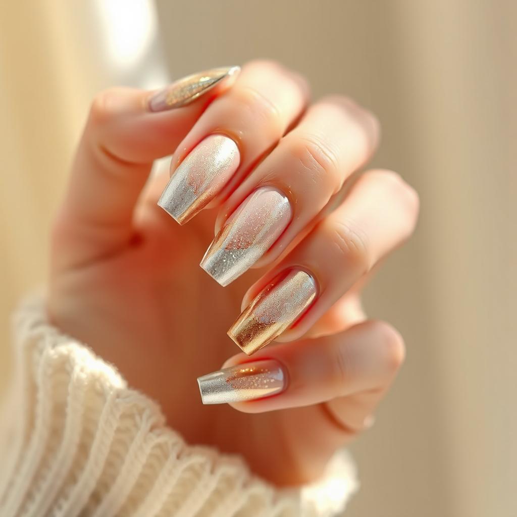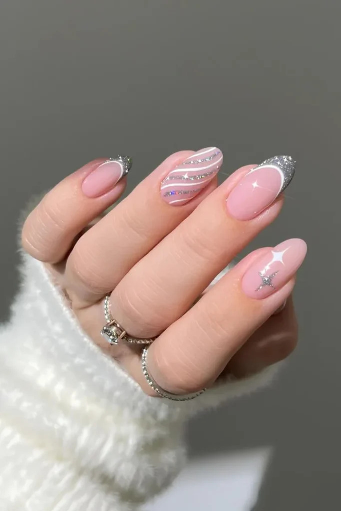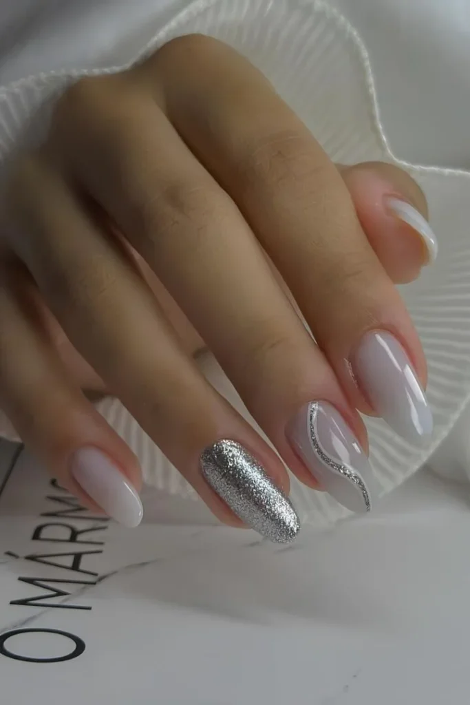 Paint one nail with shimmer, keep the rest nude—simple but effective.