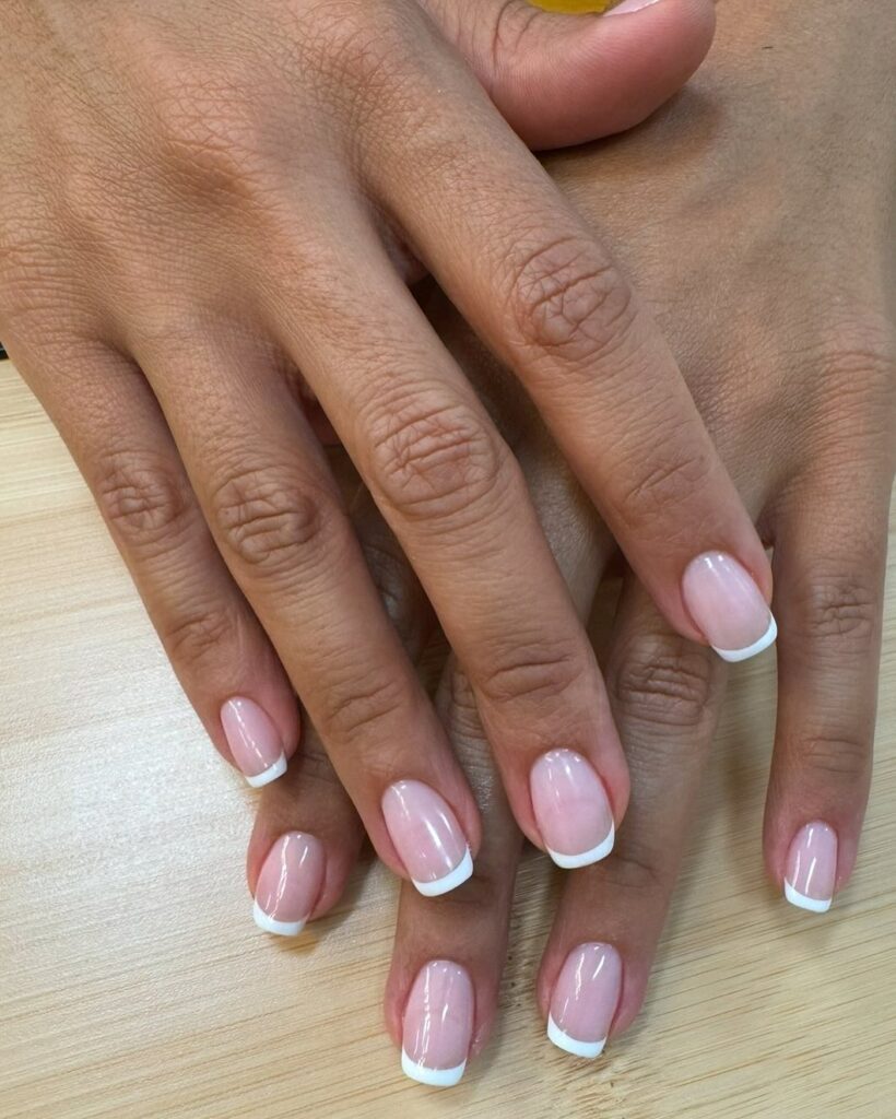 The French manicure is back—only smaller! Thin white tips on short nails are subtle yet elegant.